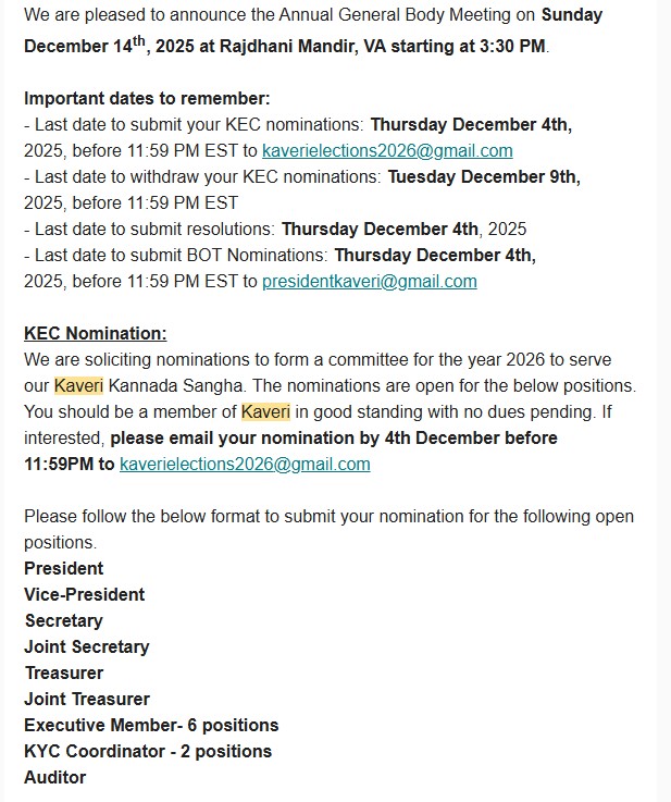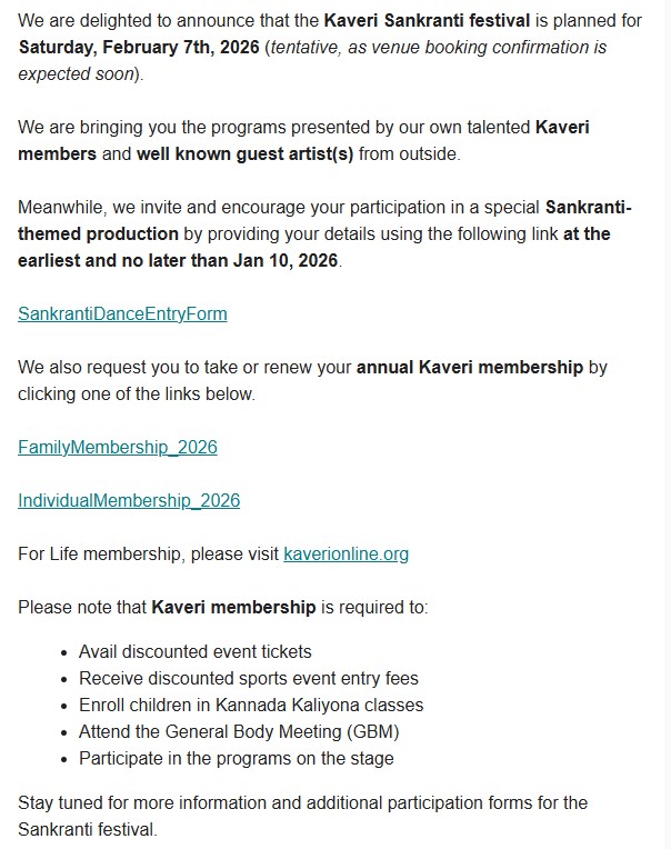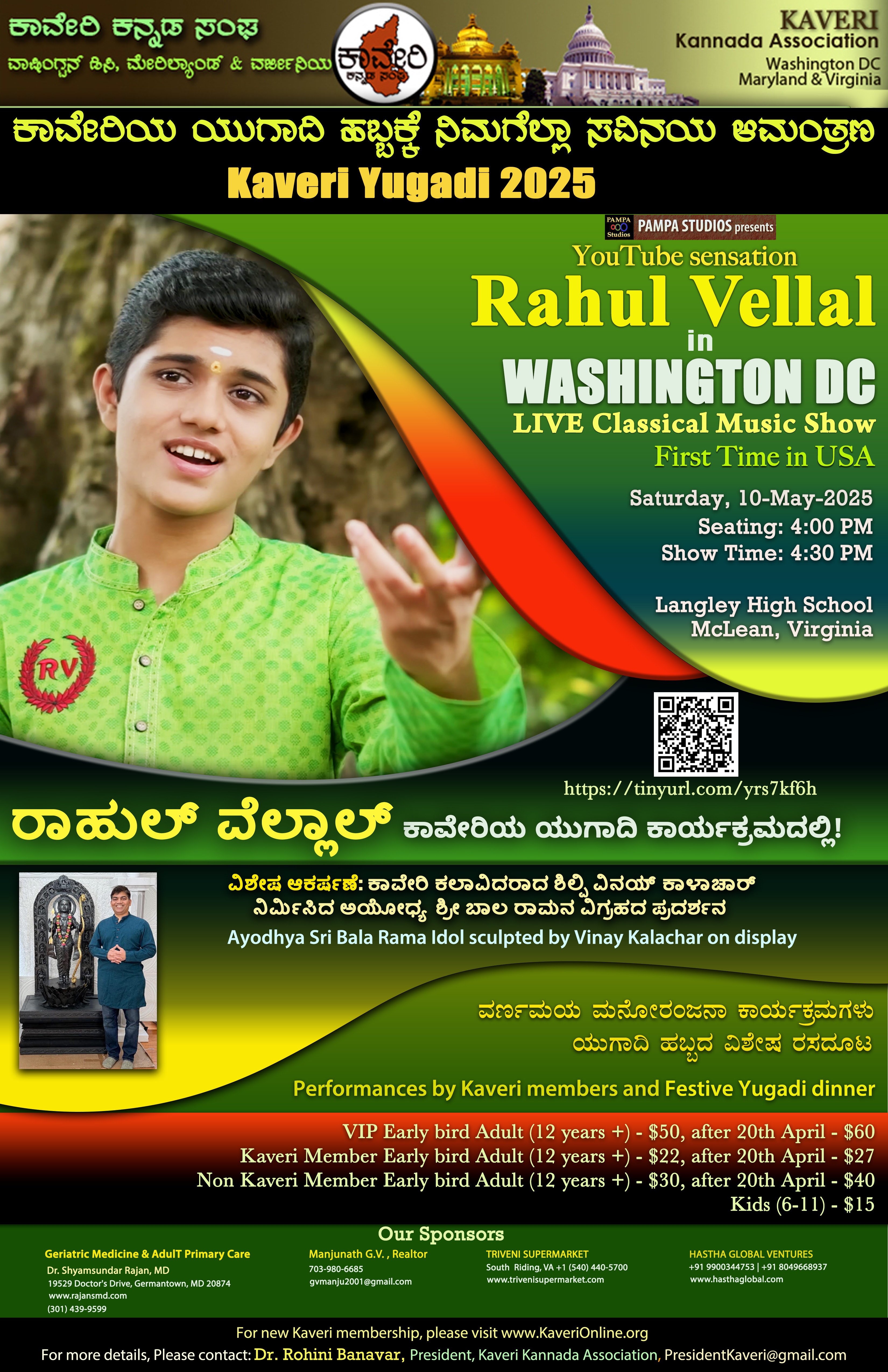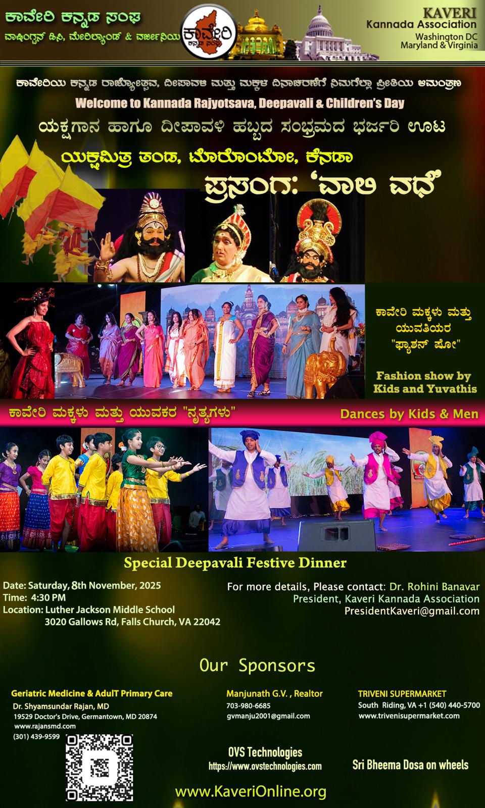 Kaveri is a cultural organization representing the Kannada speaking people from Karnataka State India, who have settled in Maryland-Washington D.C-Virginia area. The Purpose of the organization is to propagate Kannada language, culture, music, dance, and drama among the Kannada speaking people.
