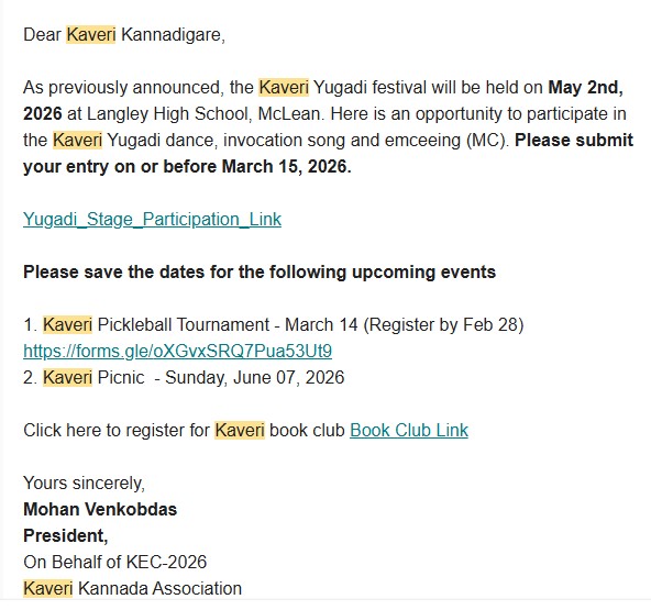 Kaveri is a cultural organization representing the Kannada speaking people from Karnataka State India, who have settled in Maryland-Washington D.C-Virginia area. The Purpose of the organization is to propagate Kannada language, culture, music, dance, and drama among the Kannada speaking people.